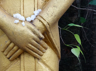 people putting candles, small balls of rice and flowers at the feet of Buddha